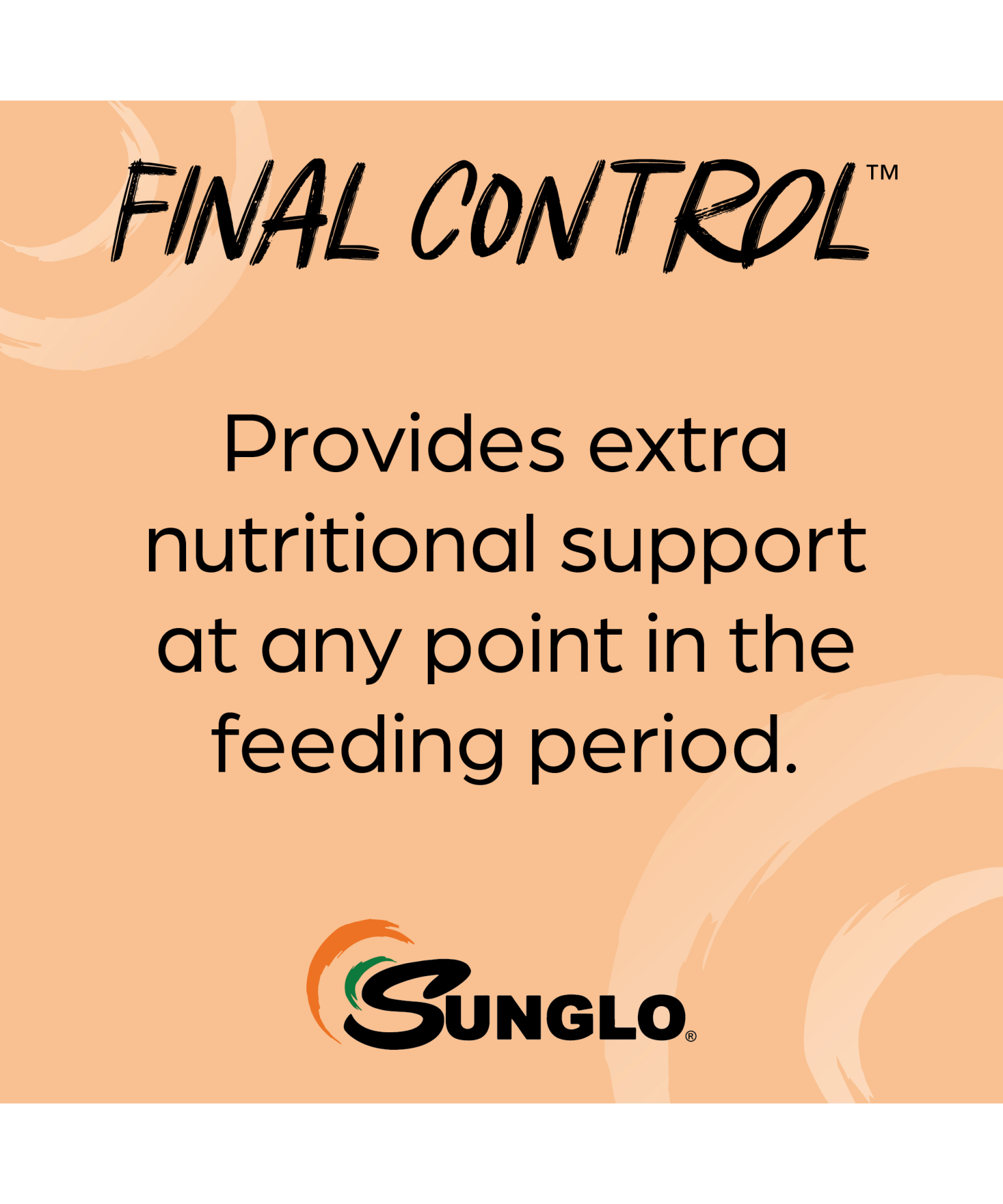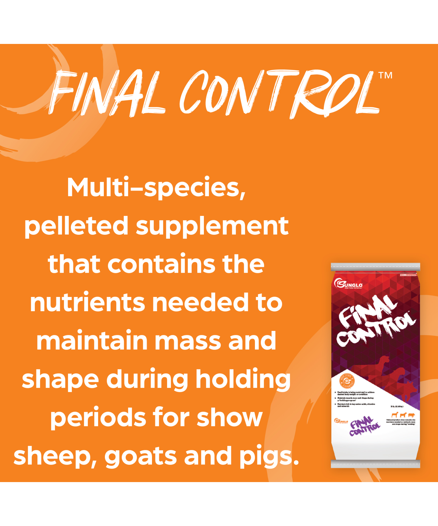 Final Control is a unique top dress product designed for use with Sunglo formulated show feeds when total feed intake is being restricted to achieve desired bodyweight or condition. Final Control supplies critical nutrients needed to maintain muscle mass and shape during a holding program.